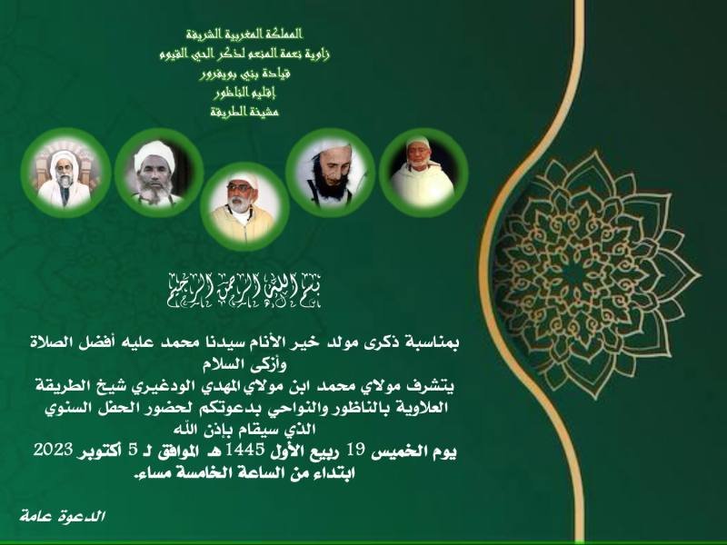 آخر المستجدات دعوة من الطريقة العلاوية لحضور الحفل السنوي بمقر الزاوية بجماعة ايكسان قيادة بني بويفرور أكتوبر 2, 2023