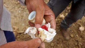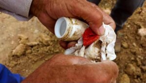 وقد لفت انتباه العمال أثناء عملهم وجود ثوب أبيض وسط كيس بلاستيكي، تبيّن أثناء فتحه أنه يحتوي على مجموعة من الاثواب وقنينة صغيرة بها ورقة بها كتابة غريبة.