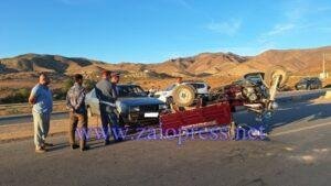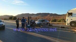 شهدت الطريق الوطنية الرابطة بين مدينتي زايو وسلوان، وبالضبط بالقرب من باحة الاستراحة الواقعة على بعد حوالي 3 كيلومترات من مدينة زايو، عشية اليوم الأربعاء، حادثة سير خطيرة إثر اصطدام بين سيارتين خفيفتين ومركبة ثلاثية العجلات (تريبورتور).