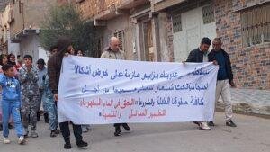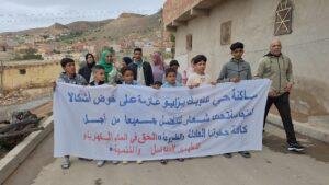 “لنناضل جميعًا من أجل حقوقنا العادلة والمشروعة: الحق في الماء، الكهرباء، التطهير السائل والتنمية”، تعبيرًا عن استيائها من الأوضاع المعيشية التي وصفوها بـ“الهشة” و“غير اللائقة” .