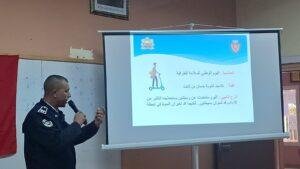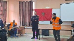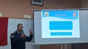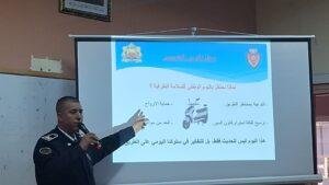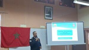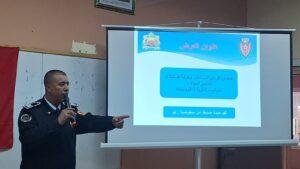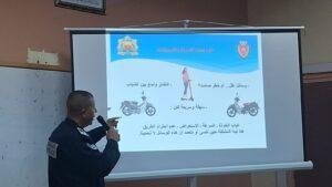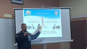 وقد أطر النشاط التحسيسي السيد محمد حيدة، ضابط أمن بمفوضية الشرطة بزايو، من خلال عرض توعوي حمل عنوان: “عجلتان تقربان المسافة… وحركة طائشة قد تختصر الحياة”، تناول فيه موضوع الدراجات ذات المحرك والتروتينات، باعتبارهما وسيلتين يستعملهما عدد كبير من الشباب. وأبرز أن هذه الوسائل، رغم بساطتها الظاهرية، قد تتحول إلى مصدر خطر حقيقي عند غياب احترام قانون السير أو التهور في الاستعمال، متطرقًا إلى الفضاء الطرقي والواقع المؤلم لحوادث السير وأسبابها، مؤكدًا أن لحظة سرعة قد تنتهي في ثوانٍ، لكن فقدان الحياة أو الإصابة قد تترك آثارًا دائمة .